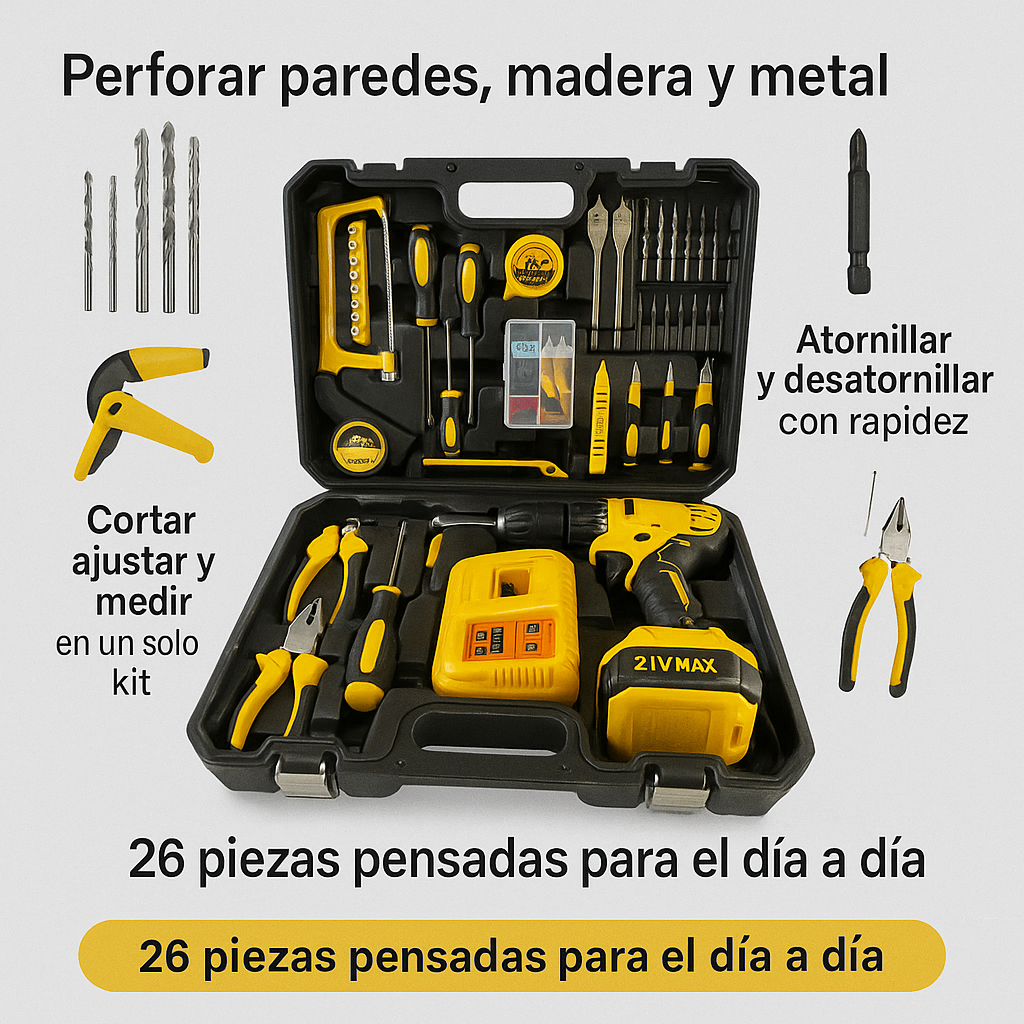 Este Set de Taladro 21V con 2 baterías y 26 piezas está diseñado para que tengas todo lo que necesitas en un solo maletín, listo para usar en cualquier momento.
